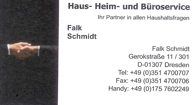 Das Unternehmen "Haus- Heim- und Büroservice" wurde vom Inhaber Falk Schmidt im Dezember 2004 als nebenberufliche Tätigkeit gegründet. Seit dem 01.12.2006 wird das Unternehmen als Hauptberuf geführt und ist somit voll Handlungsfähig. Geplant ist in Zukunft noch die Gründung einer Personengesellschaft - aber alles zu seiner Zeit!
